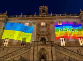 Un lungo corteo che ha attraversato i Fori imperiali per arrivare al Colosseo, illuminato a sua volta con i colori del blu come il cielo e del giallo come i campi di grano della bandiera ucraina. Uno stop alle armi e al conflitto bellico, iniziato soli pochi giorni fa con l’invasione russa. Sul palazzo Senatorio sono state proiettate le bandiere della pace e dell’Ucraina.