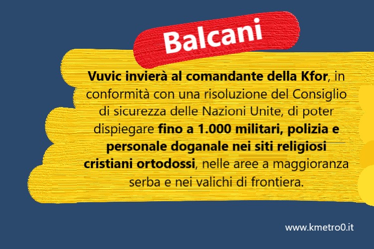 Vuvic invierà al comandante della Kfor, in conformità con una risoluzione del Consiglio di sicurezza delle Nazioni Unite, di poter dispiegare fino a 1.000 militari, polizia e personale doganale nei siti religiosi cristiani ortodossi, nelle aree a maggioranza serba e nei valichi di frontiera. “Non ci illudiamo che accetteranno; troveranno innumerevoli motivi per dirci che la Kfor ha il controllo della situazione. Quindi quello che faremo è cercare nuove vie legali”, ha detto Vucic.