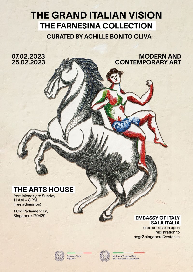 K metro 0 – Singapore – “L’arte è frutto di un immaginario che non conosce ostacoli”: esordisce così il critico Achille Bonito Oliva, nel presentare la mostra itinerante “La Grande Visione Italiana. Collezione Farnesina” da lui curata. Un percorso espositivo dinamico e articolato che da Singapore (6 febbraio 2023) farà tappa in diverse città asiatiche – Tokyo (20 marzo 2023), New Delhi (26 maggio 2023), Seoul (luglio 2023) – documentando l’incessante sperimentazione dell’arte contemporanea italiana.