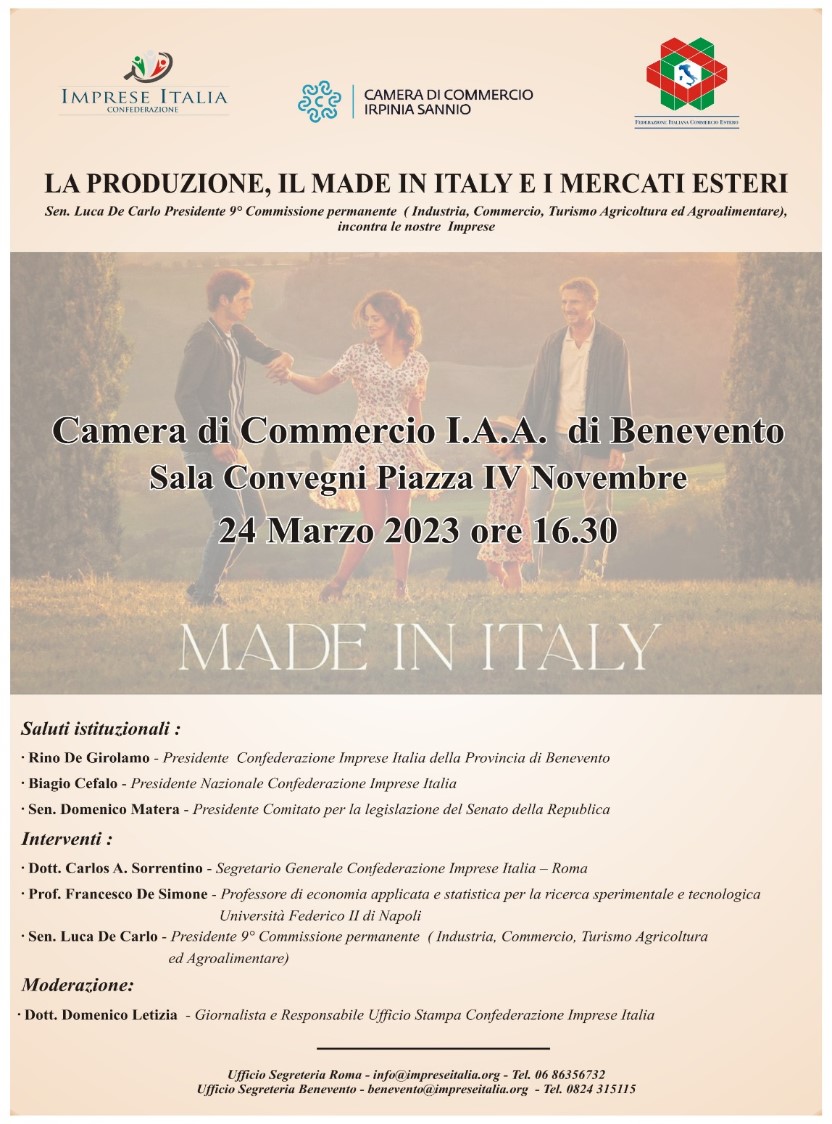L’incontro si svolgerà presso la Sala Convegni Piazza IV Novembre della Camera di Commercio di Benevento, il 24 marzo dalle ore 16.30, per approfondire con gli imprenditori e le imprese del territorio le opportunità della produzione italiana, la valorizzazione del made in italy e la diffusione delle eccellenze italiane sui mercati esteri.