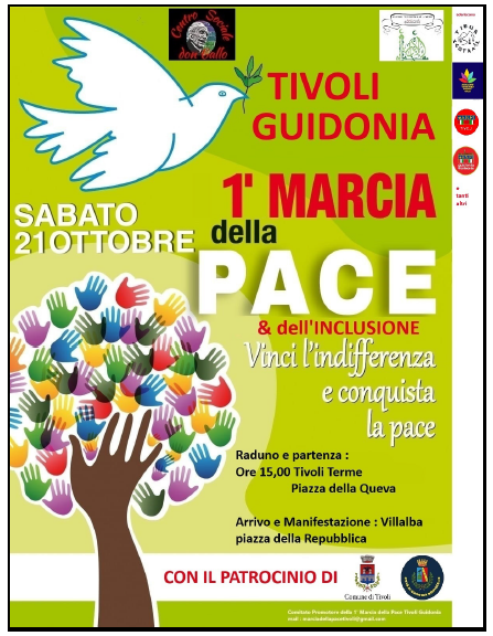 K metro 0 – Roma – Si scende in strada in nome della pace e dell’integrazione il 21 ottobre prossimo, per dare una testimonianza importante sul territorio. Saranno due comuni, Tivoli e Guidonia a unirsi – persone, associazioni, istituzioni del territorio e chiunque voglia – alla marcia della pace tra Bagni di Tivoli e Villalba,