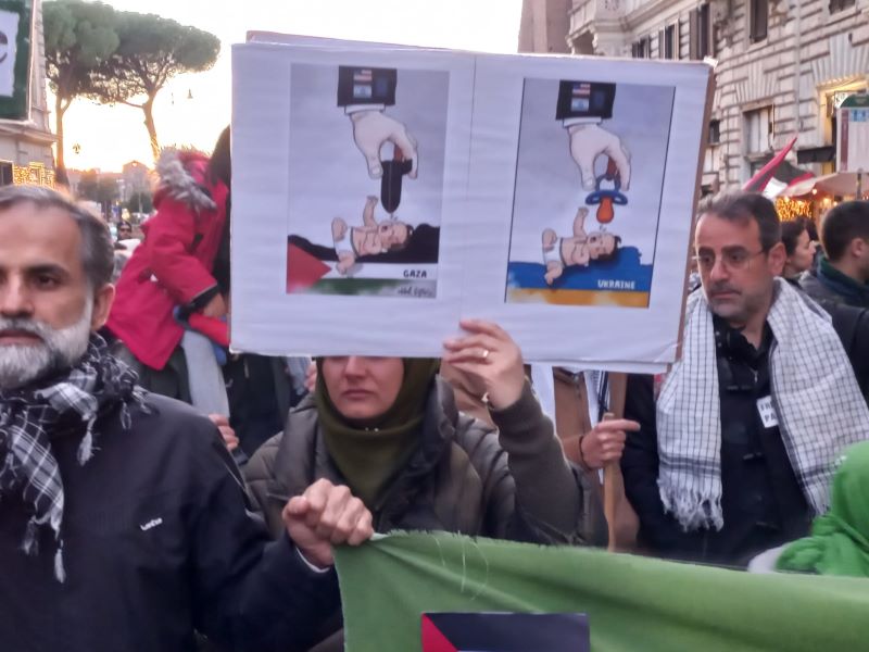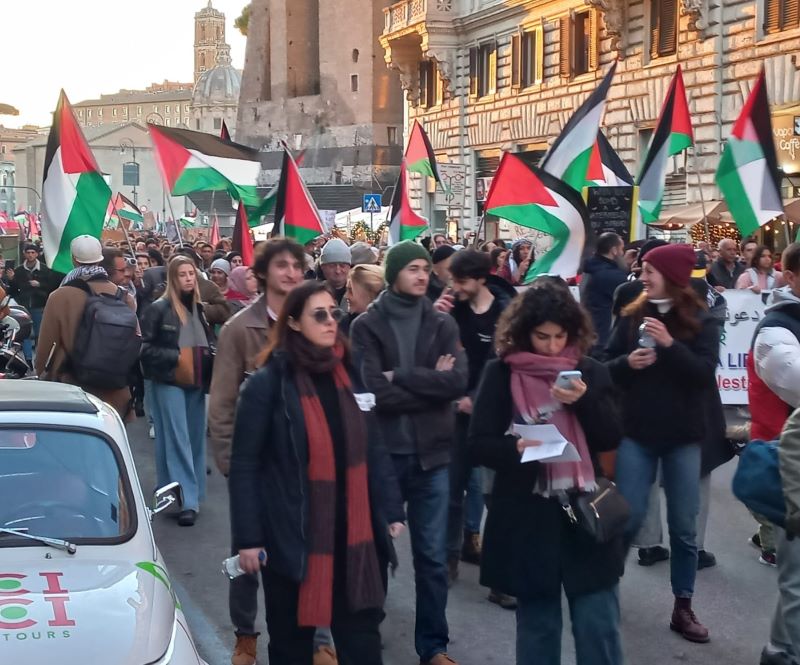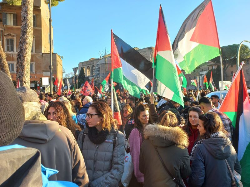K metro 0 – Roma – “Abbiamo organizzato questa manifestazione per continuare a dire basta al genocidio che è in corso a Gaza ormai da 100 giorni e non solo. Perché quei 100 giorni vanno contestualizzati nella storia, quindi è una denuncia anche a 75 anni di occupazione. Appoggiamo inoltre l’iniziativa che ha preso il