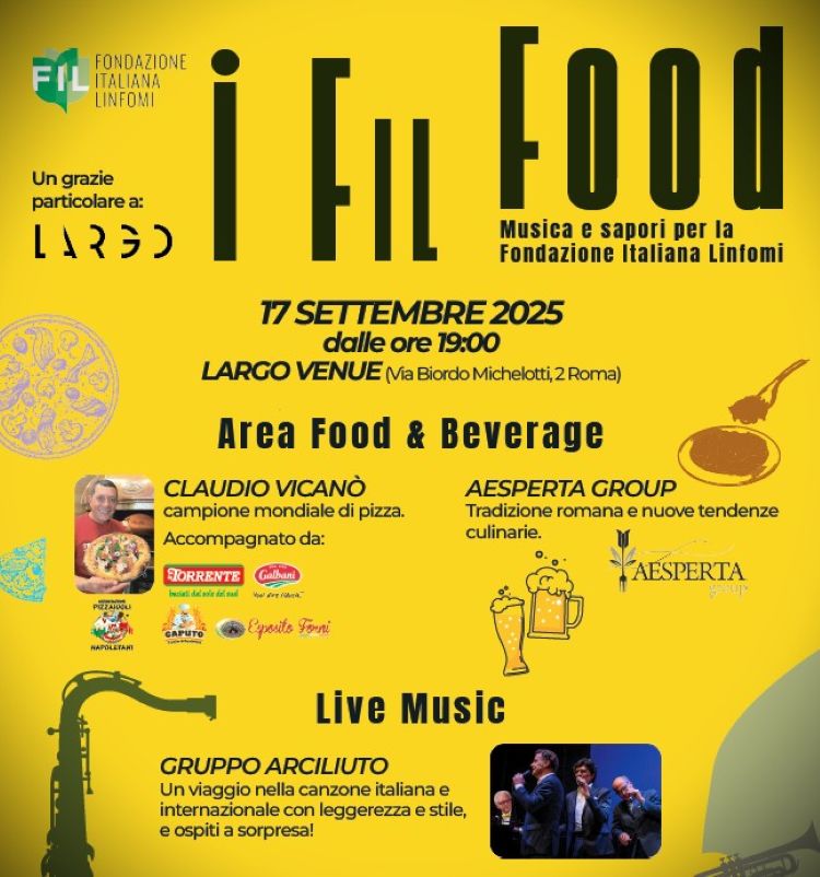 Con I FIL Food vogliamo parlare di ricerca in un modo diverso: creando un momento di condivisione, calore e leggerezza, ma con un obiettivo importante: finanziare il futuro della cura” afferma il Past President della Fondazione, Prof. Maurizio Martelli, Direttore UOC di Ematologia presso Azienda Policlinico Umberto I Dip. Medicina Traslazionale e di precisione Università “Sapienza”, che farà gli onori di casa.  “Ogni presenza, ogni pizza condivisa, ogni nota ascoltata rappresentano un passo avanti nella sfida ai linfomi, una delle malattie onco-ematologiche più diffuse in Italia. Occasioni come I FIL Food sono fondamentali per sensibilizzare, informare e sostenere chi ogni giorno affronta la malattia. Invitiamo tutti a unirsi a noi: sarà una serata di gioia, ma anche di grande valore per il futuro della cura dei linfomi. Il nostro grazie va fin d’ora ai tanti che si sono impegnati nell’organizzazione di questo evento e agli attori direttamente coinvolti nella serata, Largo Venue, Vicanò, Aesperta, Arciliuto e gli altri ospiti musicali, che con generosità metteranno a disposizione la loro professionalità per la nostra buona causa”.